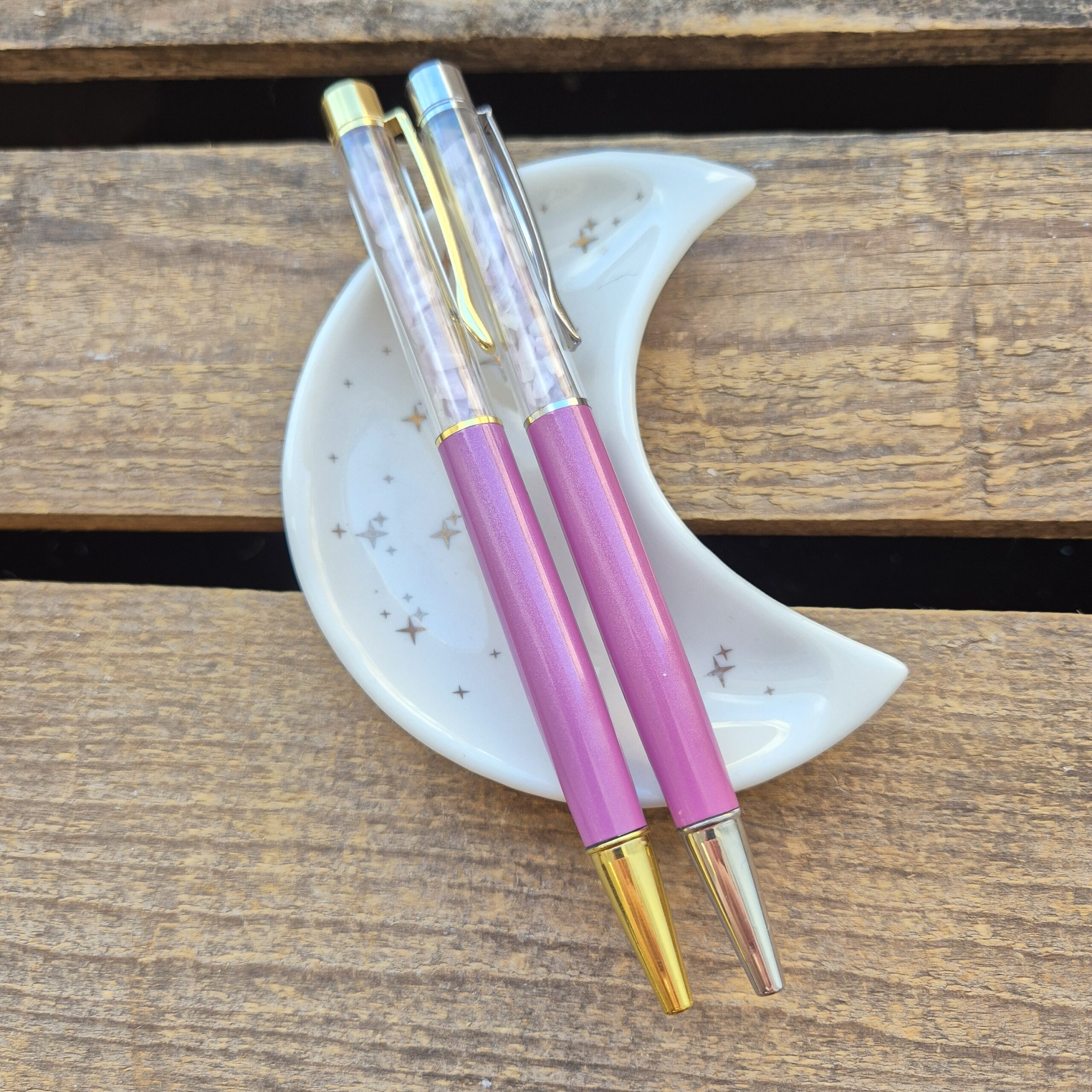 Fin kulepenn fylt med kunzitt-chips.