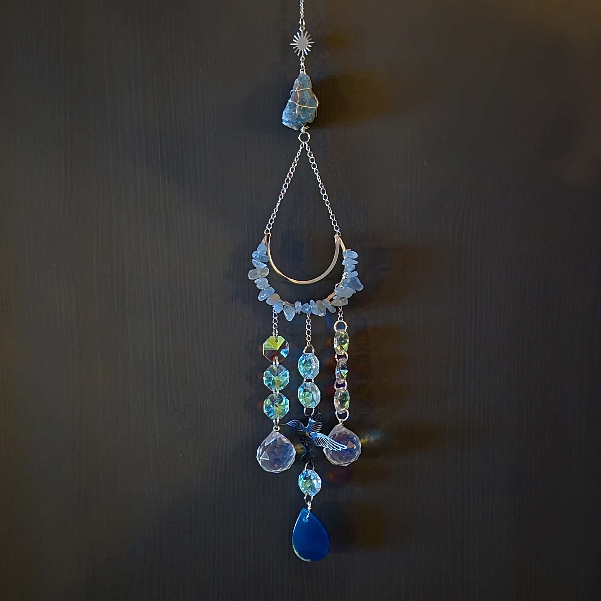 Solfanger (suncatcher) måne/kolibri akvamarin