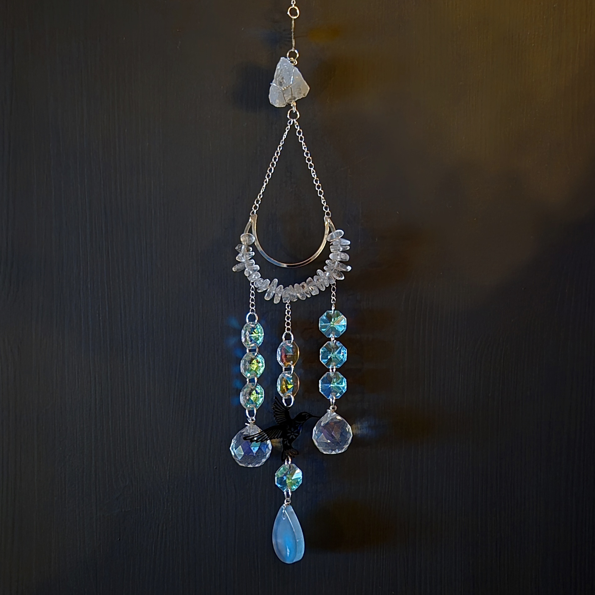 Månen og råbiten er med bergkrystall. Denne er helt blank så det skinner farge gjennom krystallene!