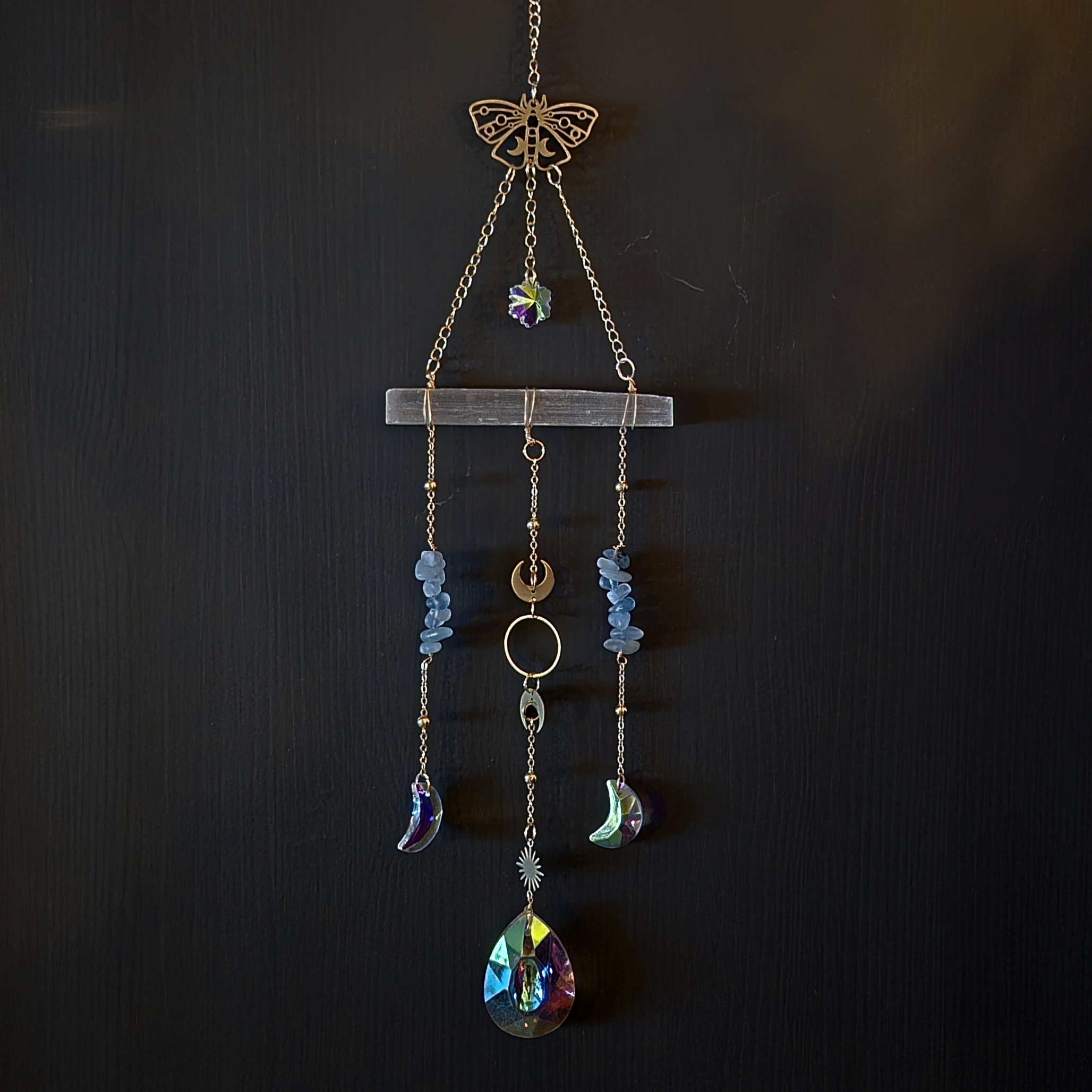 Dråpe og måner er fasettslipt glass, det er denne som lager fargespillet når solen skinner på den.