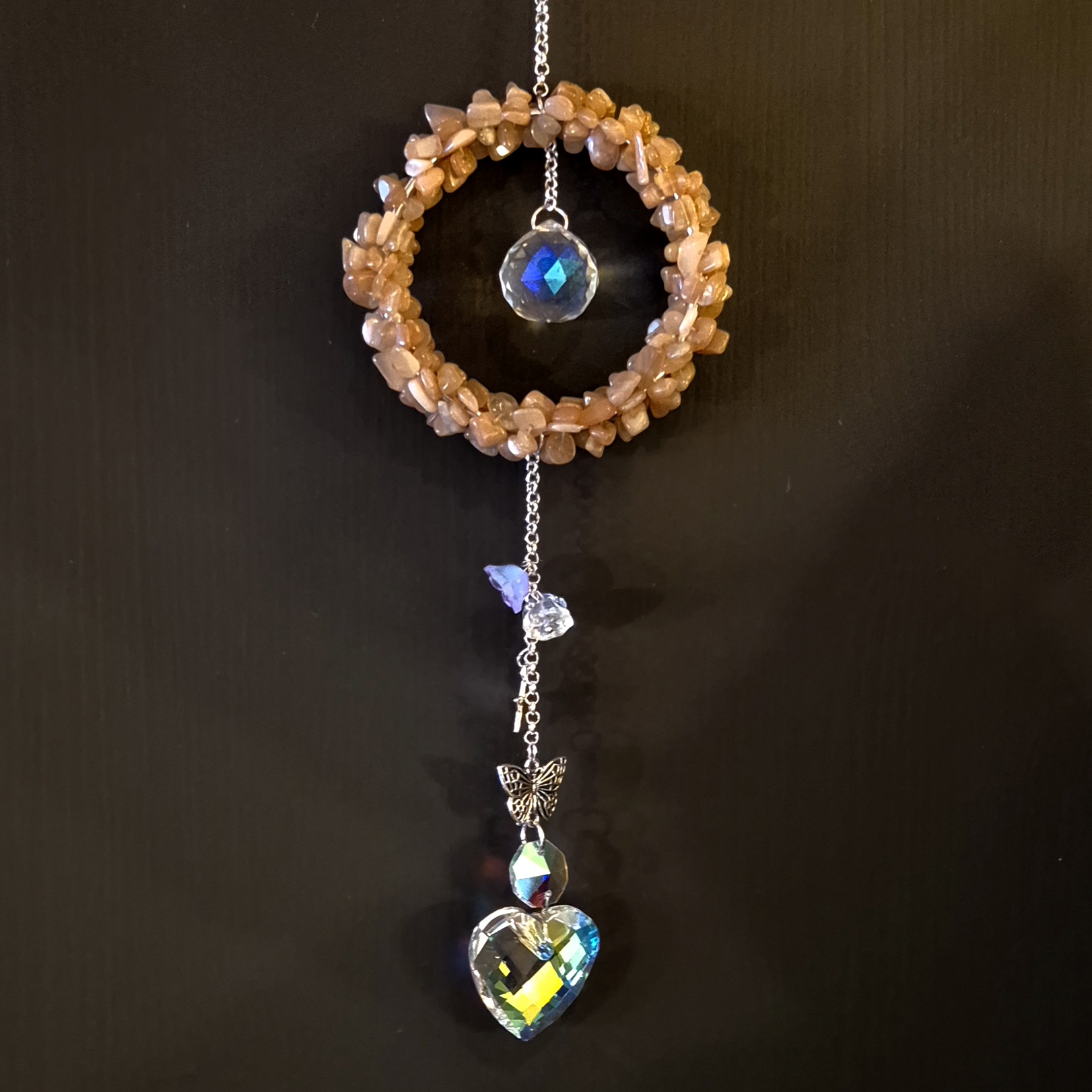 Dråpe/hjerte er fasettslipt glass, det er denne som lager fargespillet når solen skinner på den.