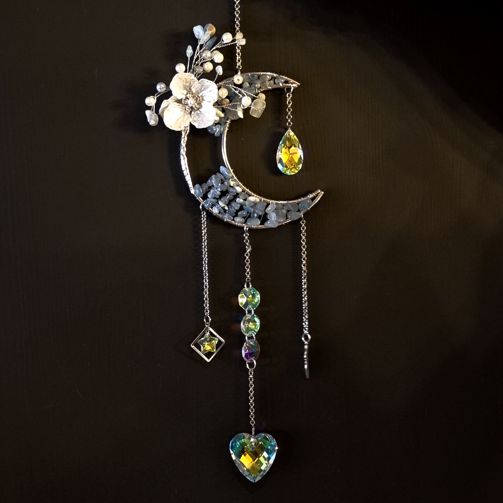 Dråper og hjerte er fasettslipt glass, det er denne som lager fargespillet når solen skinner på den.