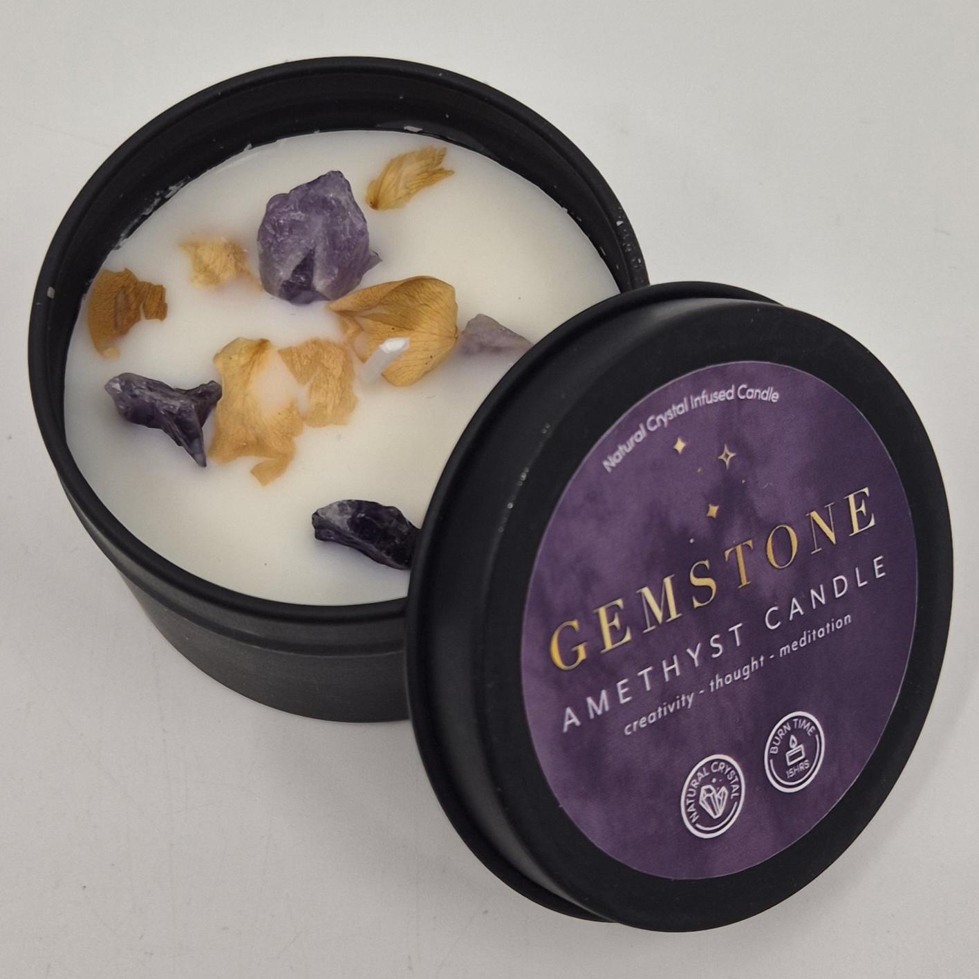 Produktinformasjon: Hvert lys inneholder små biter av edelstener og tørkede blomster i voksen. Lyset er ikke parfymert, men plantene har en svak naturlig duft.