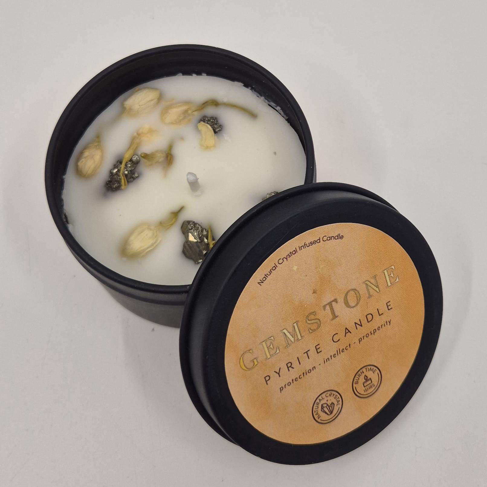 Materiale: Edelstener (ametyst, bergkrystall, rosenkvarts, celestin, pyritt, fluoritt), bivoks (Cera Alba) 50 %, soyavoks (50 %), tørkede blomster (rose, kamille, Momordica grosvenori, lavendel, jasmin, indisk jomfrutall), lysolje og metall (jern).