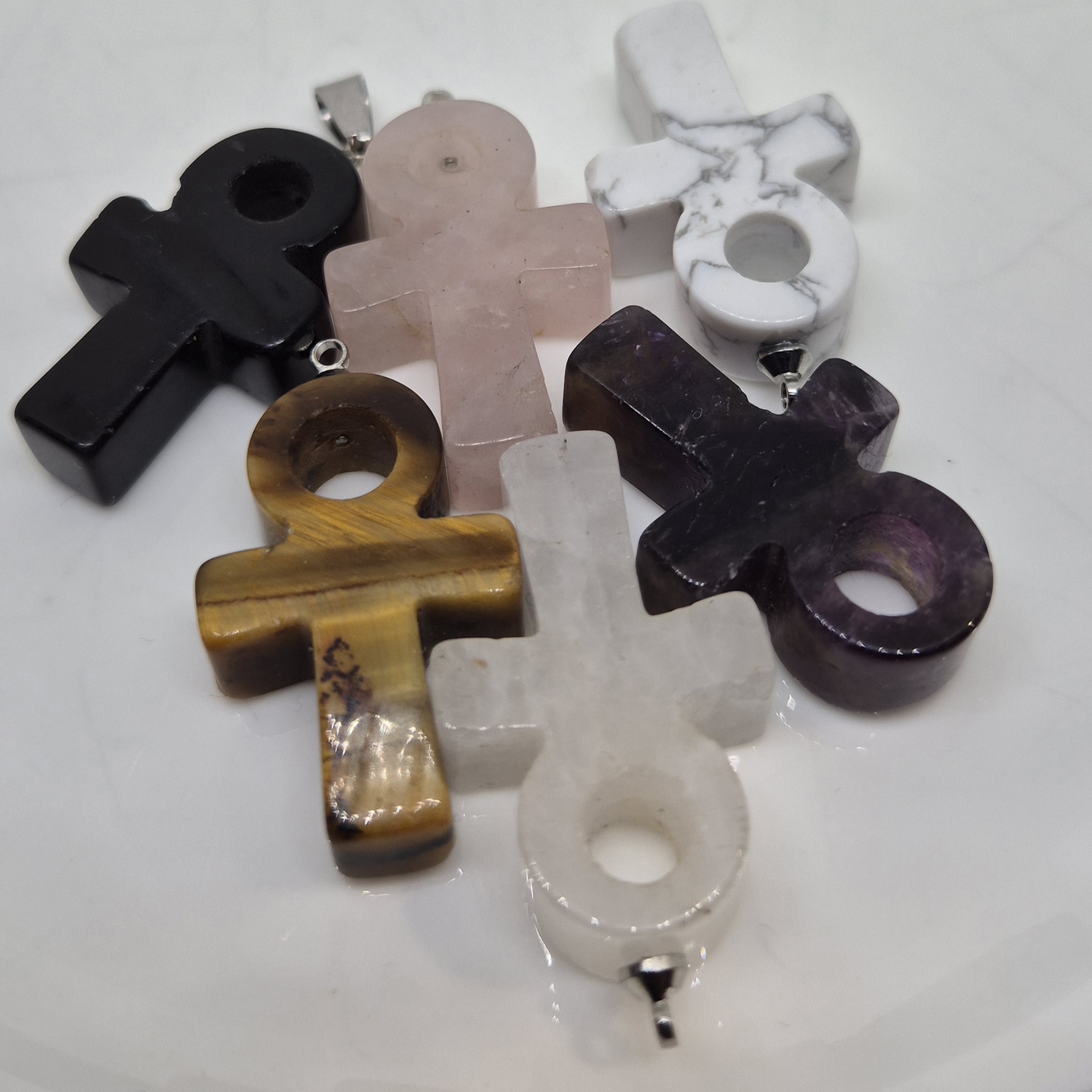 Rosenkvarts, Bergkrystall, Ametyst, Tigerøye, Sort obsidian, Hovlitt