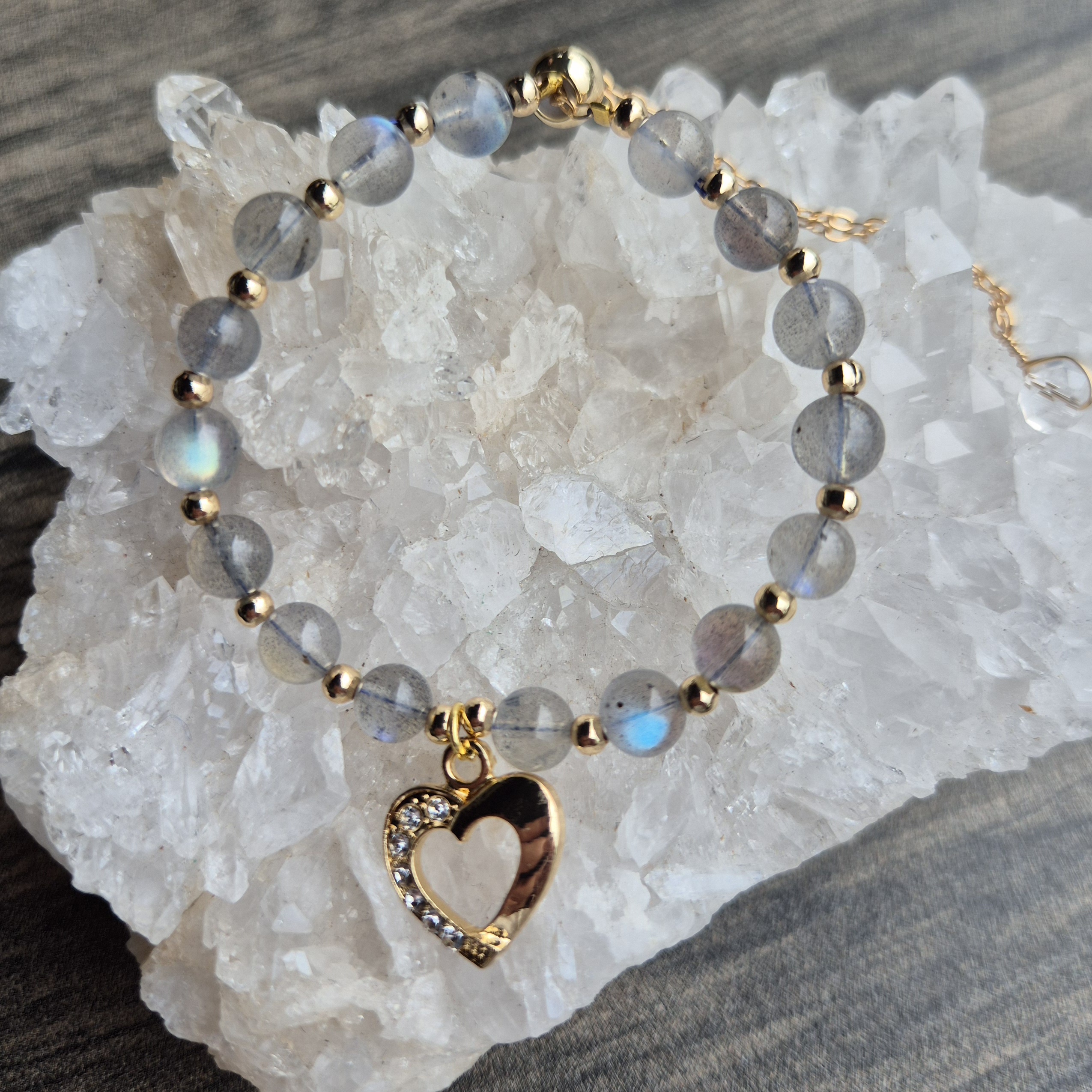 Armbånd labradoritt med hjerte gull.
