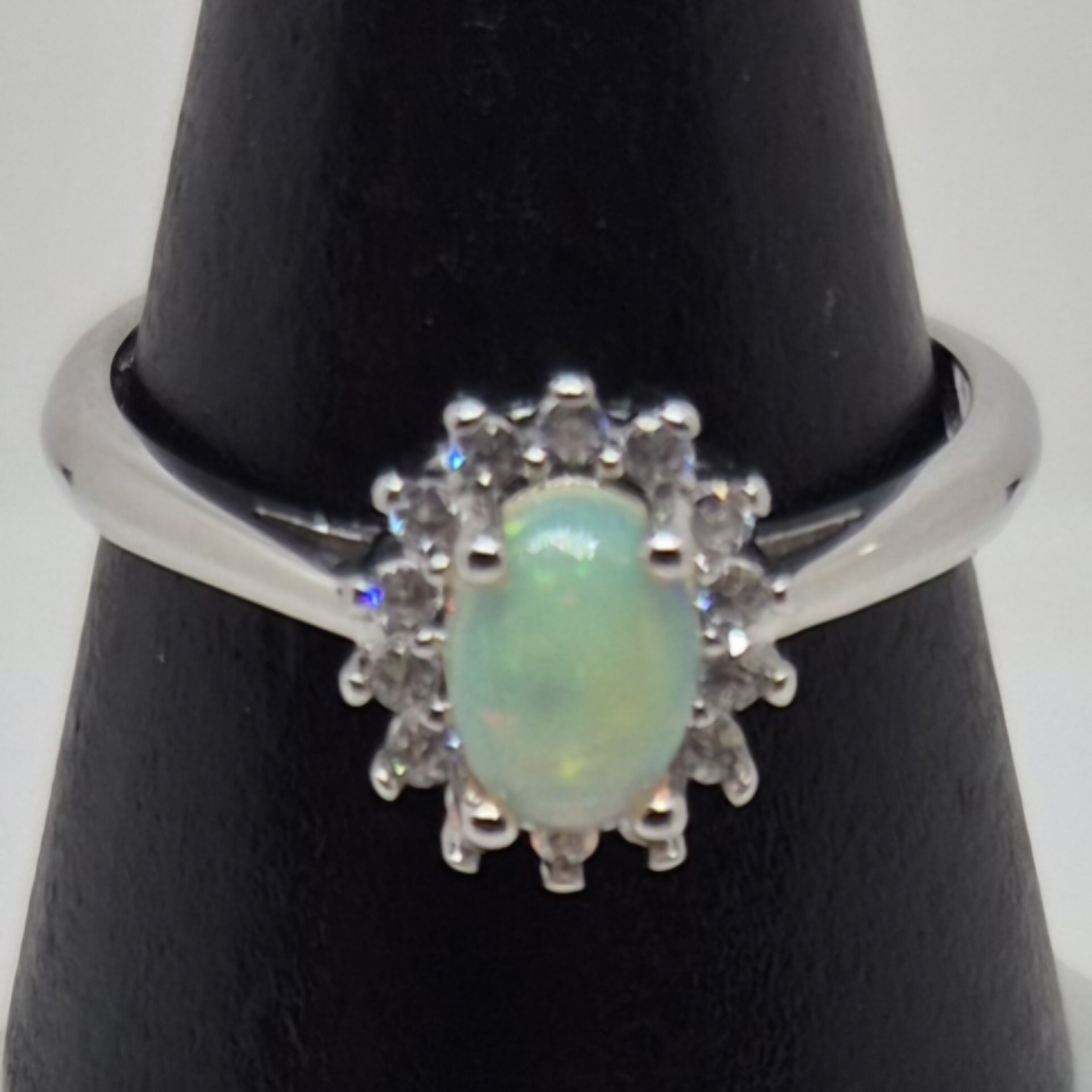 Sølvbelagt og justerbar ring med opal lys.